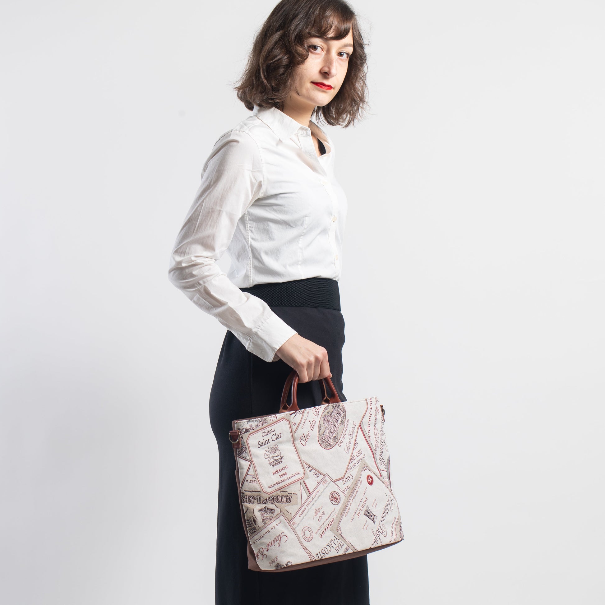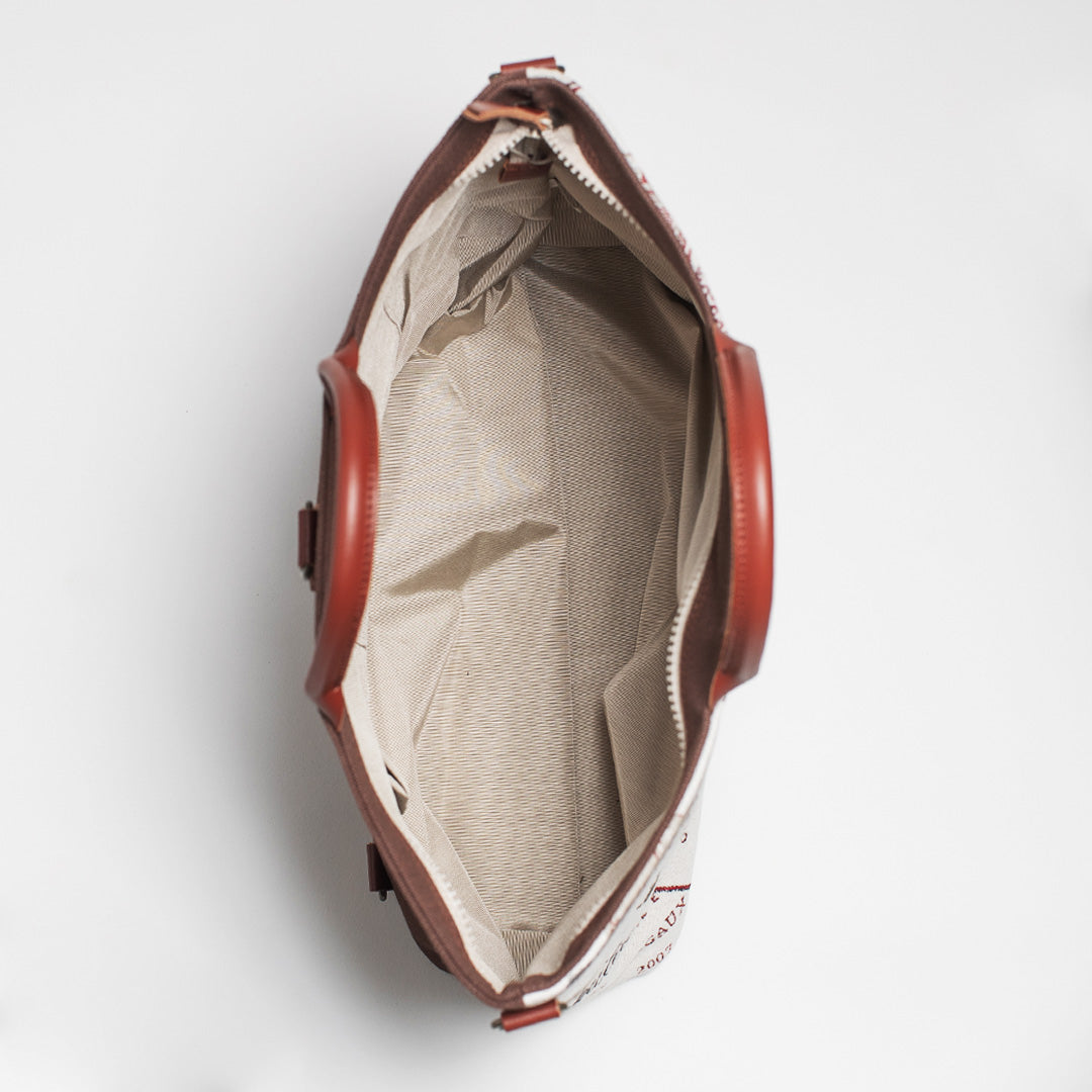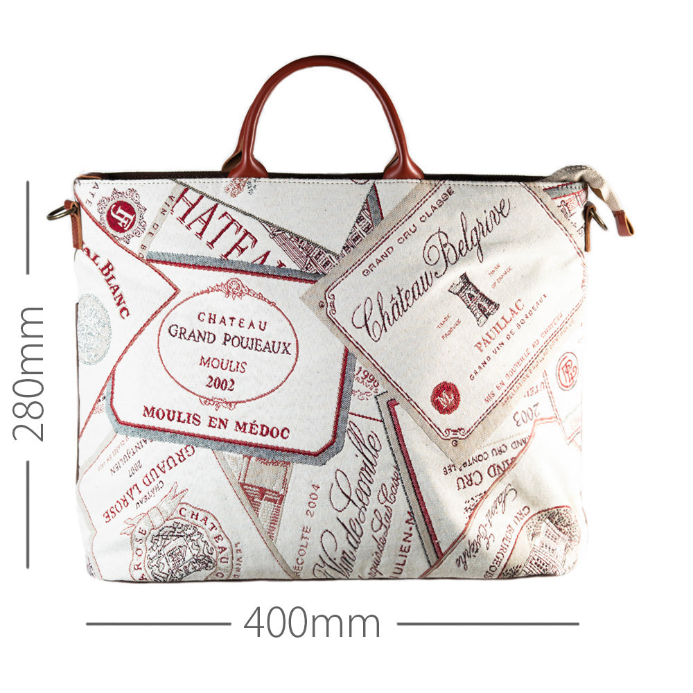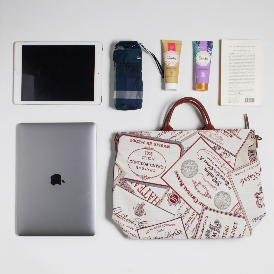 ワインラベル ( 背面 茶 ) 表地:綿 60% ポリエステル 40% 別布:綿 裏地:レーヨン 持ち手:牛革