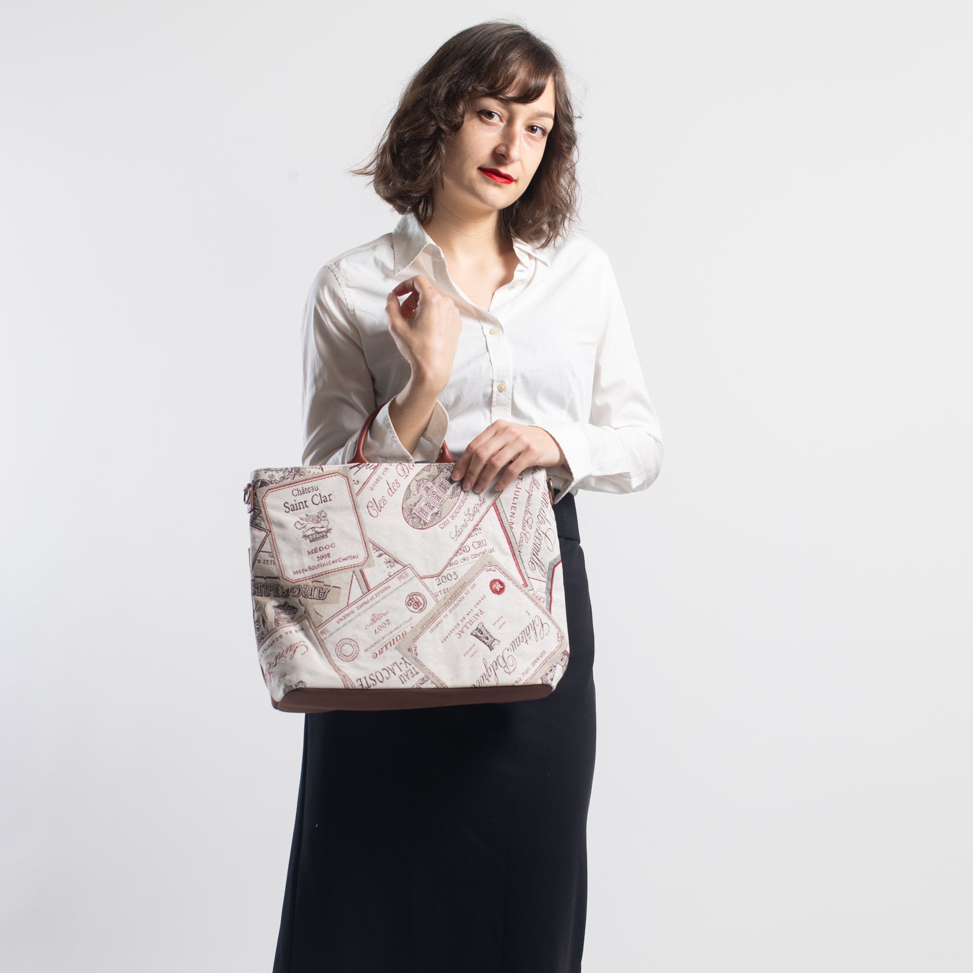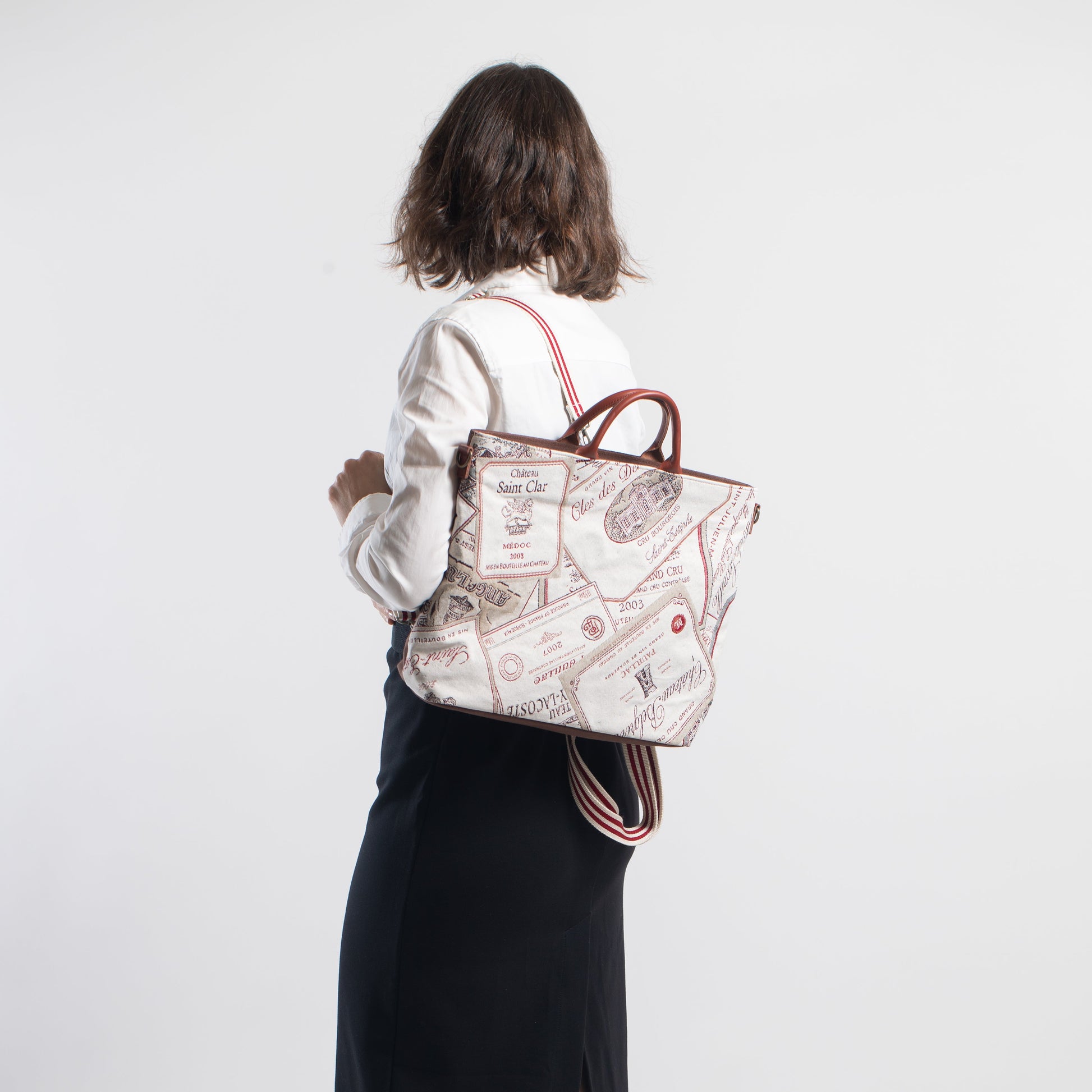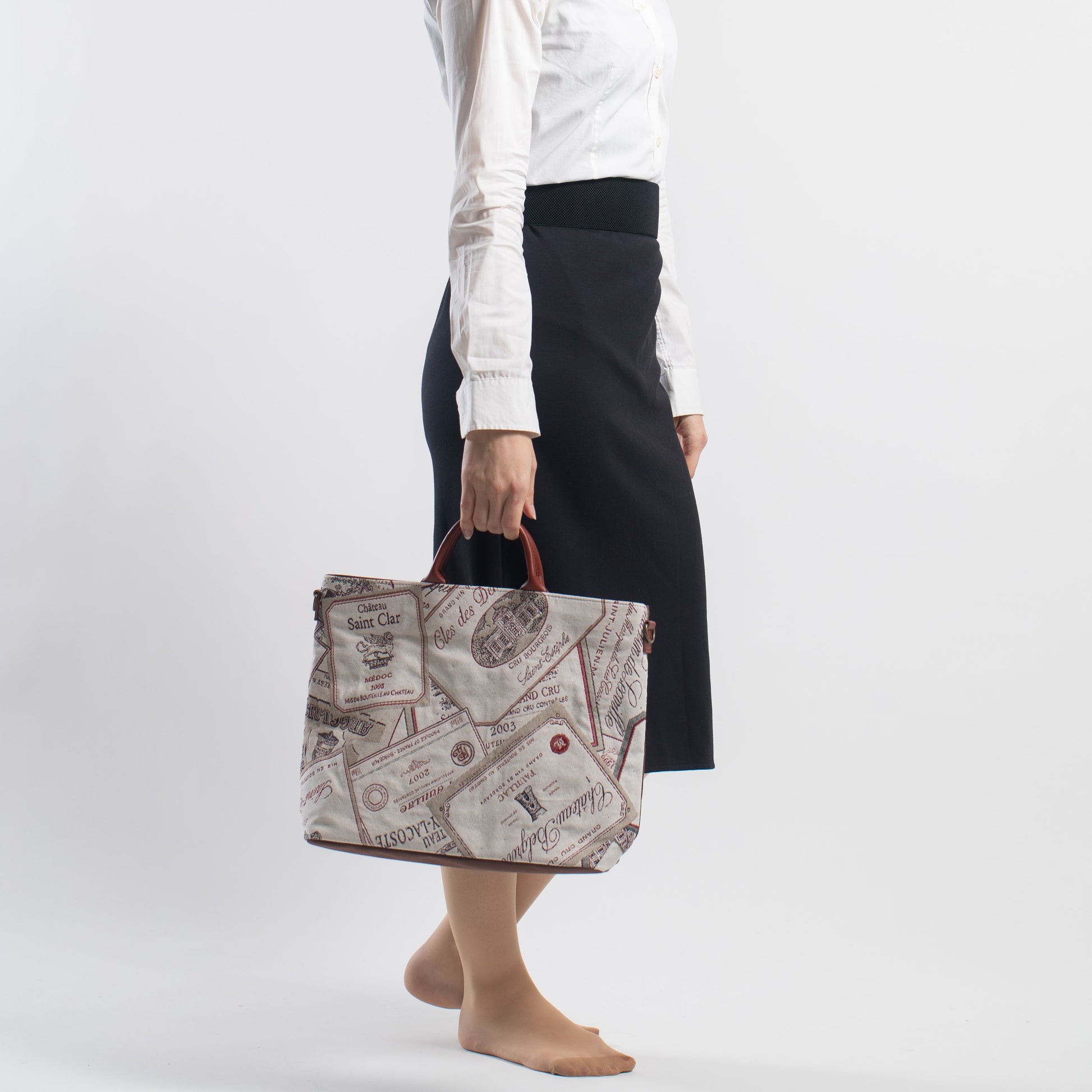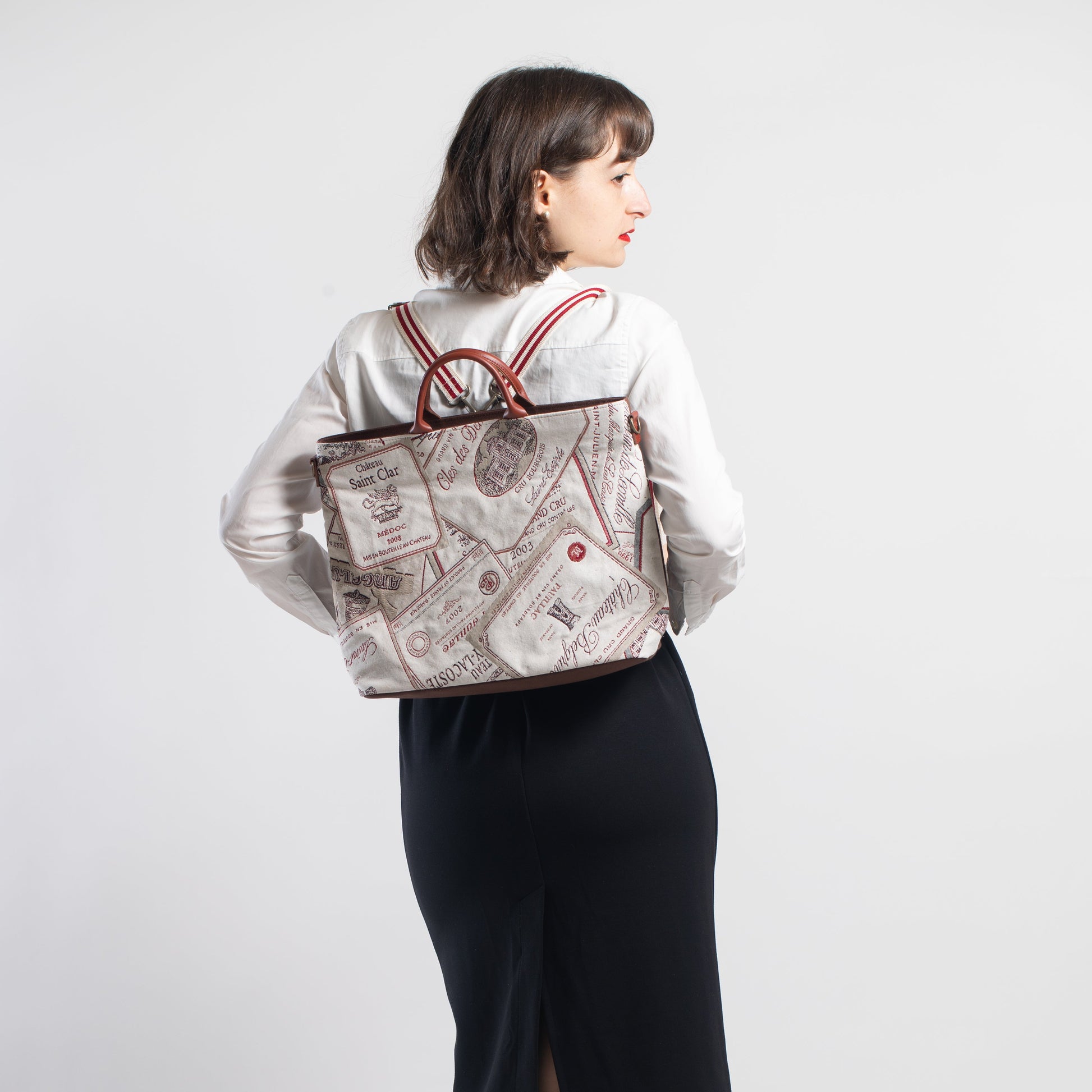 ワインラベル ( 背面 茶 ) 表地:綿 60% ポリエステル 40% 別布:綿 裏地:レーヨン 持ち手:牛革