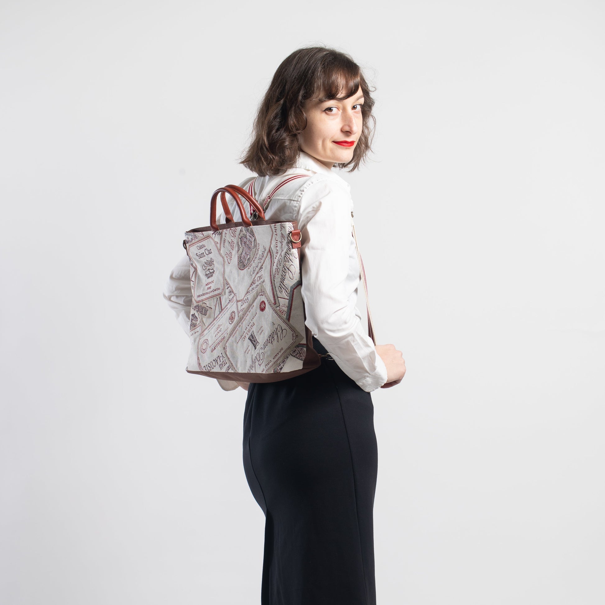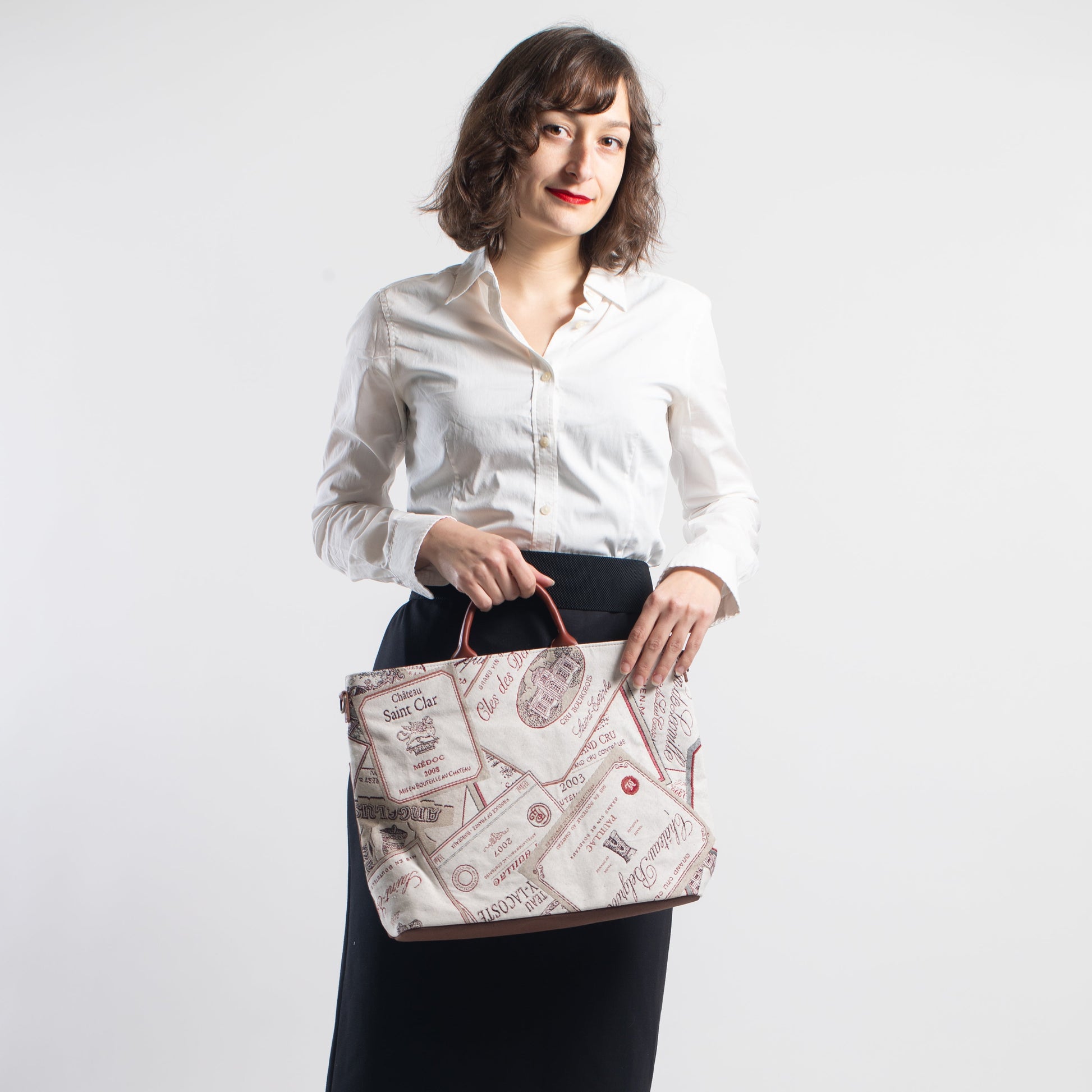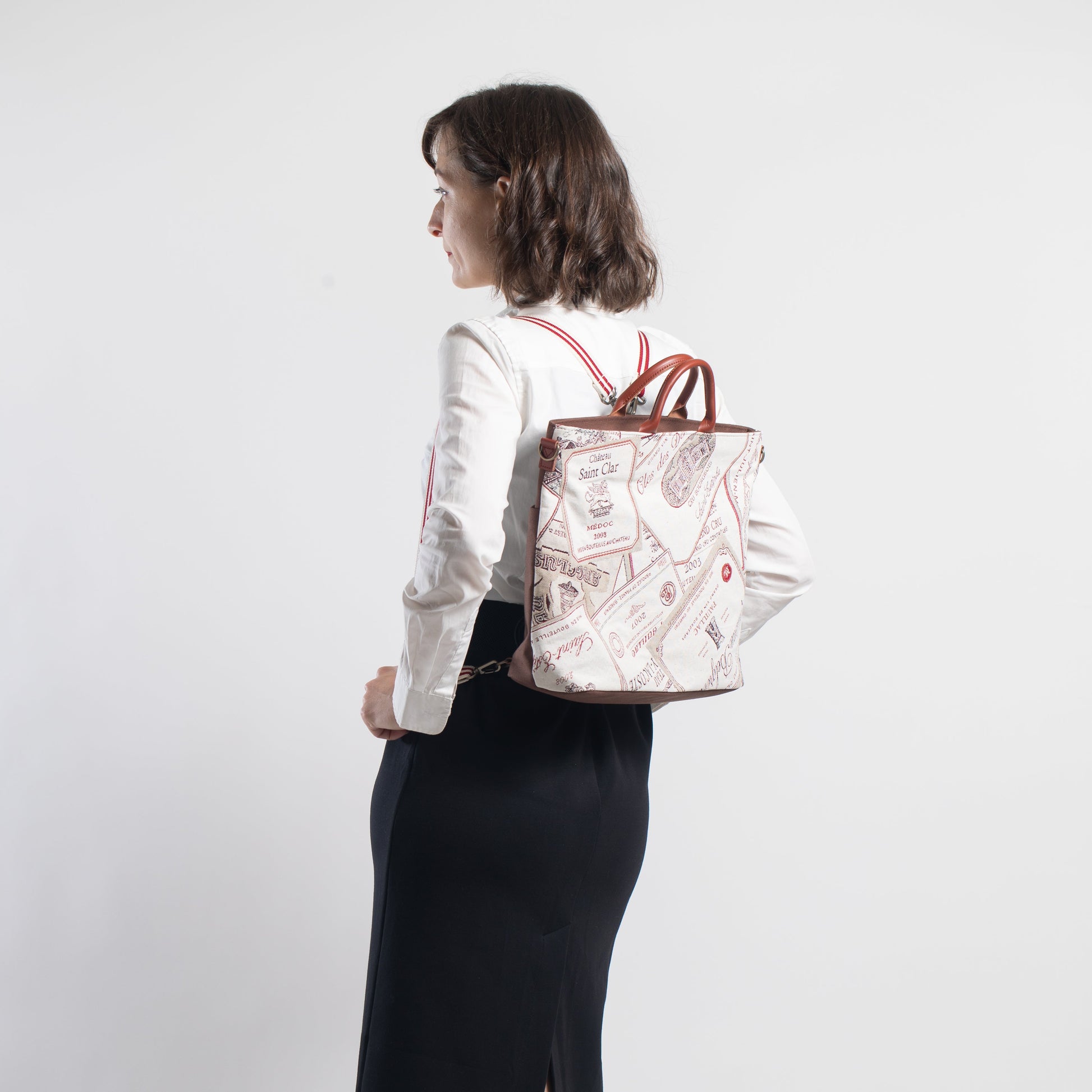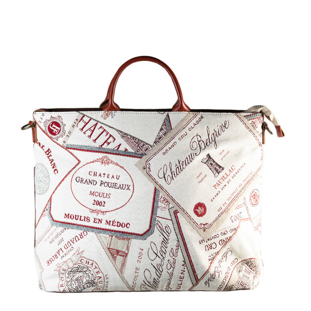 ワインラベル ( 背面 茶 ) 表地:綿 60% ポリエステル 40% 別布:綿 裏地:レーヨン 持ち手:牛革